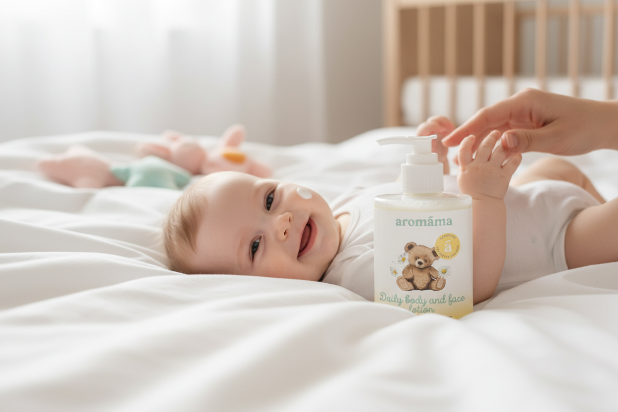 Daily body and face lotion - a gentle solution for the skin of your baby and child. This lightweight, pleasant consistency product is rapidly absorbed by the skin, leaving no greasy residue, while it softly hydrates and calms the skin, ensuring a prolonged sensation of comfort.